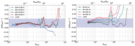 Figure 9 presents two further systematic studies where the reference calibration function is applied to data collected with different overvoltages or with a different delay between the two light sources. Also, in this case, up to a signal equal to , the response is linear within ±5%.