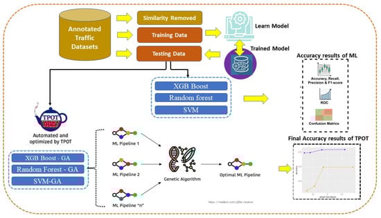 We employed a supervised learning method for classification. These findings then suggested an integrated XGB algorithm with GA, RF algorithm integrated with GA, and SVM algorithm integrated with GA, used with Tree-based Pipelines Optimization Tool (TPOT) with GA be applied during the feature selection stage as shown in Figure 1. A further complication for the present hypothesis is that proposed and implemented initial scheme model frameworks used for building ML Pipeline 1, Pipeline 2, and the total number of Pipeline N as machine learning algorithms, were then integrated with genetic algorithms associated with the optimal ML Pipeline. An open-source AutoML tool called TPOT automates the pipeline optimization process for machine learning. TPOT assists in the automatic search for the optimal ML pipeline, which includes feature selection, model selection, hyperparameter tuning, and data preprocessing, using genetic programming [].