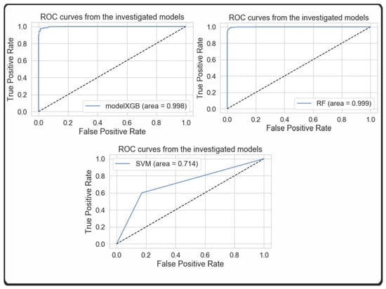 This comparison analysis is further expanded to analyze the training performance of machine learning models through the use of k-fold cross validation and Area Under Curve (AUC) analysis of the Receiver Operating Characteristic (ROC) curves. The ROC curve is a tool that can be used to evaluate the performance of a classification model by taking into consideration the False Positive Rate (FPR) and the True Positive Rate (TPR). Figure 4 illustrates the ROC(AUC) graphs of XGBoost, Random Forest, and SVM, respectively.