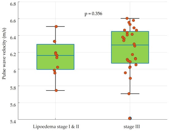 On average, the determined pulse wave velocity (adjusted for age and systolic blood pressure) was 6.15 ± 0.21 m/s in lipedema stages I and II and 6.23 ± 0.28 m/s in stage III [minimum, Q1, median, Q3, and maximum at stages I and II: 5.75/6.00/6.16/6.30/6.51 versus stage III: 5.41/6.10/6.29/6.45/6.60], as shown in Figure 1.