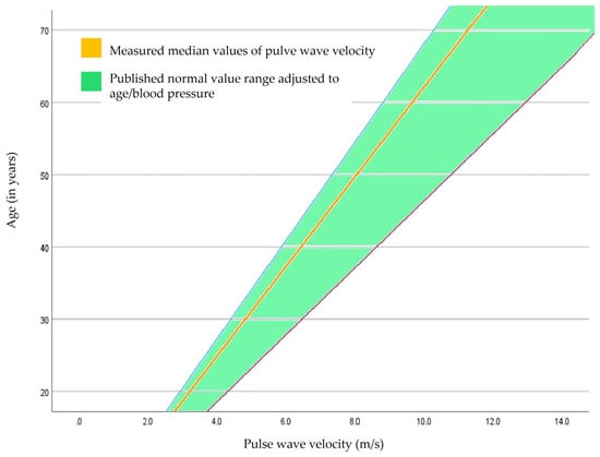 The measured pulse wave velocity values were compared to published standard values adjusted to age and blood pressure (Table S2, Supplementary Materials) [].