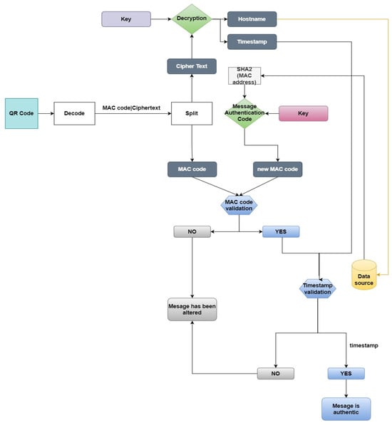 Figure 3 and Figure 4 describe the procedure of the QR code generation, which contains the sender’s information and the procedure used for the decryption and evaluation of the sender identity through a comparison of the information included. The algorithm aims to serve as a robust security measure for email communication.