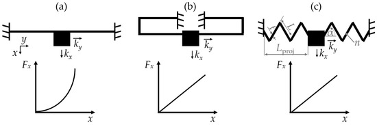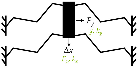 Guiding mechanisms enable translational in-plane displacement of Micro-Electro-Mechanical Systems (MEMS) and are, therefore, among the most important components of microsystems technology. In MEMS, linear guiding mechanisms are used in a wide variety of applications such as in electrostatic actuators [1], or in inertial MEMS to guide proof masses. Usually, these applications require a guiding mechanism that is compliant in the displacement direction and stiff in all other directions. For a solid spring, this means that it should have a low stiffness, kx, in the deflection direction, x (i.e., the slope of the force–displacement characteristic (FDC)), but high stiffnesses in the orthogonal y-direction (ky). The ratio of the stiffness can be defined as the selectivity, S, with