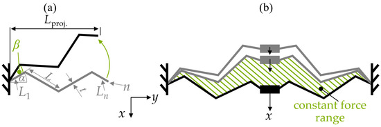 The tilted triangular spring is characterized by a tilting angle, β, as shown in Figure 2a. The properties of this spring are defined by the number of straight elements, n, their length, L, the thickness, t, depth, d, of the device layer, and the inclination angle, α. Figure 2 also shows the projected length, Lproj. Based on the results that we achieved in [2], we aim to achieve symmetrical force-displacement curves. Therefore, we only used springs with an even number of beams, i.e., n = 2, 4, 6, …, and the length of the first, L1, and the last beam, Ln, is half the length of the other beams, i.e., L/2. The triangular spring achieves a constant force reaction with a preset initial tilting angle, β, as an additional degree of freedom. To realize a translational displacement, we use a symmetric design (Figure 2b). As shown in Figure 2b, the constant force range (CFR) arises with the progressing displacement of the spring; consequently, the tilted triangular spring achieves a partially constant spring force.