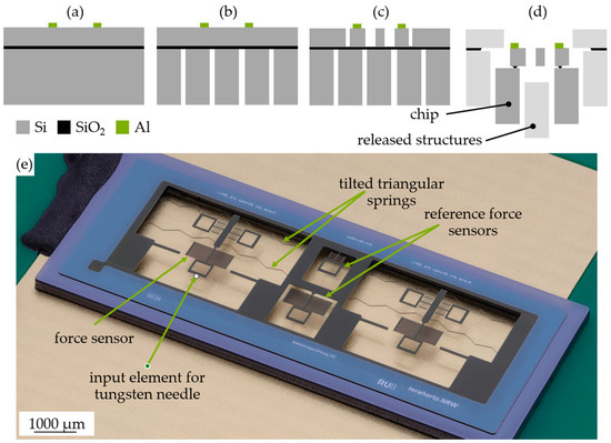 The chips were manufactured in a dicing-free process for silicon-on-insulator (SOI) substrates known from [20] using a device layer of 20 µm and a handle layer of 300 µm; this is shown in Figure 7. First, a 100 nm aluminum layer was sputtered on the device layer. The aluminum was used for the electrostatic activation of the comb-drive electrodes. Afterwards, the electrical contacts were patterned by lithography and wet chemical etching, so that the mechanical structures were not covered with aluminum (Figure 7a). In the next step, we etched the handle layer by deep reactive ion etching (DRIE) using a SiO2-hard mask (Figure 7b). To structure the device layer, we used a hard mask of aluminum nitride (AlN) and DRIE (Figure 7c). The chips were released from the substrate by hydrofluoric vapor etching (Figure 7d). Afterwards, the chips were fixed on PCBs. The simulated thickness of the springs was 5 µm; however, the fabricated thickness was 4.8 µm. Figure 7e shows a stacking photo of a fabricated chip with the spring demonstrator. Each spring system consists of a slider with two tilted guiding springs on each side. We provided the springs with additional force sensors to experimentally determine the force reaction on-chip. The chips also contain reference force sensors to determine the stiffness of the force sensors.