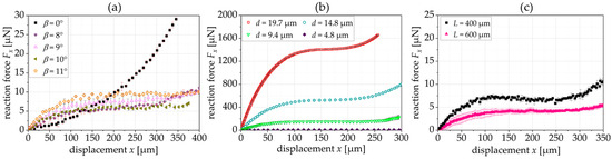 (a) Reaction force, , as a function of β, (b) stiffness, , as a function of β, (c) stiffness, , as a function of β; simulation results for an exemplary spring with L = 400 µm, t = 5 µm, n = 6 and α = 20°.