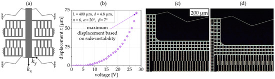 We use the spring characterized in Figure 9 with a tilting angle of β = 7° to guide an electrostatic comb-drive actuator. Figure 11a shows a schematic of the setup of the actuator; Figure 11b shows the voltage-dependent displacement with a relatively large displacement at low voltage. The maximum displacement is 71 µm at 28 V, and at larger voltages, side instability occurs. Figure 11c,d show the displacing electrodes.