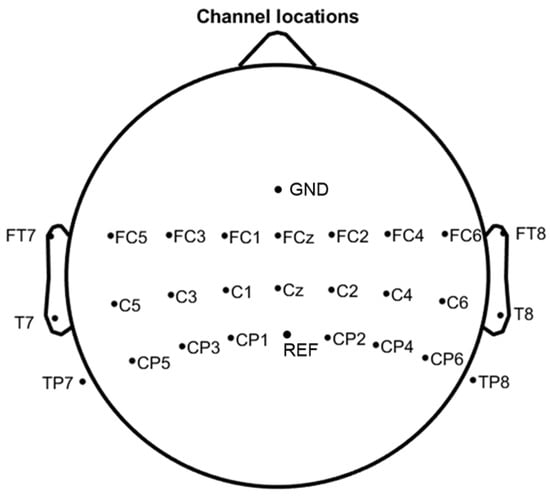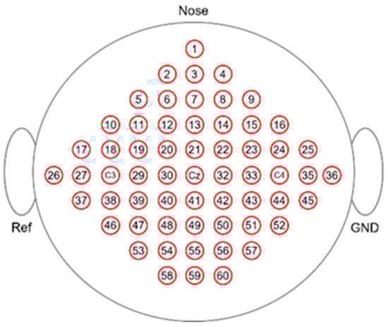 The Chinese Academy of Medical Sciences autonomous dataset is a two-class EEG dataset which was acquired using a 64-channel Neuracle EEG amplifier, with the REF channel for reference and the GND channel as ground. The sampling frequency for the data was set at 1000 Hz. The electrode locations adhered to the international 10–20 system. The distribution of the channels is shown in Figure 3.