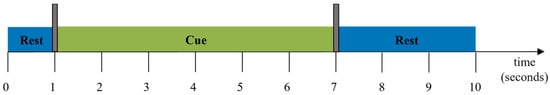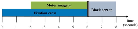 The BCI Competition IV Dataset 1 was acquired from 59 EEG channels [28,29]. For each subject, two classes of motor imagery were chosen from the three classes: left hand, right hand, and foot. Each trial began with a 2 s display of a fixation cross at the center of the screen, followed by the presentation of cues (arrows pointing left, right, or down) for 4 s. Participants were instructed to perform the corresponding MI task during this period. Subsequently, a 2 s blank screen ensued. The fixation cross overlaid the cues and was displayed for 6 s. Each of the two runs consisted of 100 trials, and the timeline for each trial is depicted in Figure 6.