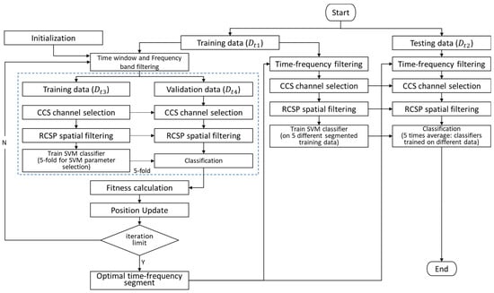 In this work, we used SSA to determine the optimal time–frequency segments, specifically the time window and frequency band of EEG. Additionally, optimal channels were selected using the CCS method, and the RCSP method was applied to extract features before SVM classification. The framework of the proposed SSA-CCS-RCSP is shown in Figure 7.