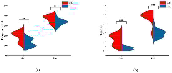 Optimal time–frequency segment distributions. (a) Frequency start and end point distribution; (b) time segment start and end point distribution. *** and ** above certain lines denote that the distribution of time and frequency between two subjects was significantly different at the 0.001 and 0.01 levels of significance. The two closely spaced dashed lines at the top and bottom represent the maximum and minimum values, while the dashed line in the middle represents the median.
