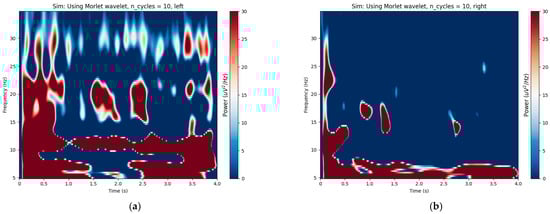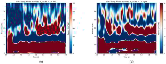 Time–frequency plot with wavelet analysis. (a) Left-hand task of participant K3b; (b) right-hand task of participant K3b; (c) left-hand task of participant L1b; (d) right-hand task of participant L1b.