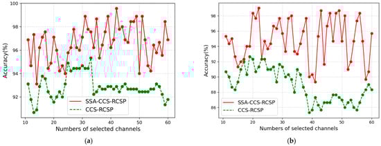 It can be observed from Figure 12 that, with data from different channels, the accuracy of the SSA-CCS-RCSP method consistently exceeded the accuracy of methods based on non-customized time–frequency ranges. The results indicate that this algorithm can be generalized to data with different channel counts.