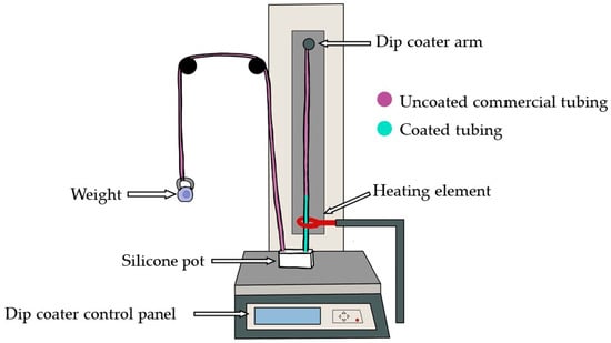 To construct the vessels, the elastomer mixture was poured into a silicone pot. The dip-coating method was set up as illustrated in Figure 1 and followed the methodology created by Nomoni et al. []. The commercial silicone tubing, employed as the form (Hilltop Products Limited, Warrington, UK) for the custom vessels, was positioned on pulleys and threaded through a heating element by the Precision Dip Coater (Qualtech Products Industry, Denver, CO, USA). One end of the form was attached to a tension weight, while the other side was secured to the dip-coater arm. The heating element was activated for three minutes, reaching a temperature of 275 °C. The elastomer was then poured into the silicone pot, and a coating layer of the elastomer mixture was applied by pulling up the form at a fixed speed of 40 mm/min, enabling the tubing to pass through without premature curing. The heating element was deactivated once the arm had reached its highest point, and the dip-coated tubing was left to cure. The internal form was carefully separated from the cured custom vessel.