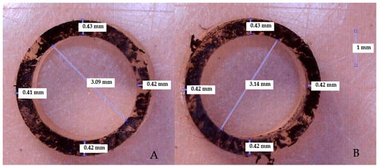 To investigate the impact of the formulations on the vessel wall thickness, sections of the constructed vessels, each 1 mm in length, were sliced from both ends. These sections were then stained with black paint to enhance viewing contrast and examined under a digital microscope (Celestron, Torrance, CA, USA) for wall thickness measurements, as illustrated in Figure 2. The sample size comprised three stained cross-sections from each side of the vessel, totalling six cross-sections for each vessel. Still pictures were captured using Celestron MicroCapture Pro software version 2.5 (Celestron, Torrance, CA, USA). The wall thickness of each section was measured four times and averaged. The mean value for each vessel was determined by finding the average between both ends of the vessels. The same process was employed to determine the internal diameter (ID). The OD was calculated based on ID by adding the thickness on each side of the vessel wall.