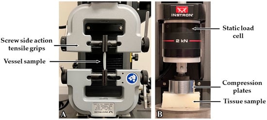 The Universal Testing System (Instron 5944, Norwood, MA, USA) was used in a tensile test configuration to measure the Elastic Modulus of each custom vessel, as shown in Figure 3. This involved two grips holding a vessel with a length of 15 cm in place and vertically drawing the sample apart with a drawing speed of 500 mm/min until the material reached its breaking point. This procedure was set in accordance with the ASTM D412 standard []. Along with the previously calculated vessel diameter and thickness measurements, each vessel was universally loaded with a force of 0.10 N to calculate Young’s modulus using Bluehill Universal software version 4.42 (Instron, Norwood, MA, USA). This process was repeated for each vessel to observe differences in elastic properties with varying levels of retarder, deadener, and hardener. For the tissue samples, the system was set to the compression test configuration (as seen in Figure 3) to measure the Elastic Modulus of each tissue phantom. Each tissue phantom measured 50 × 20 × 20 mm (L × W × H). The phantoms were placed on a flat metal plate and compressed to calculate Young’s modulus. A drawing speed of 12 mm/min was set in accordance with the ASTM D575-91 standard [].