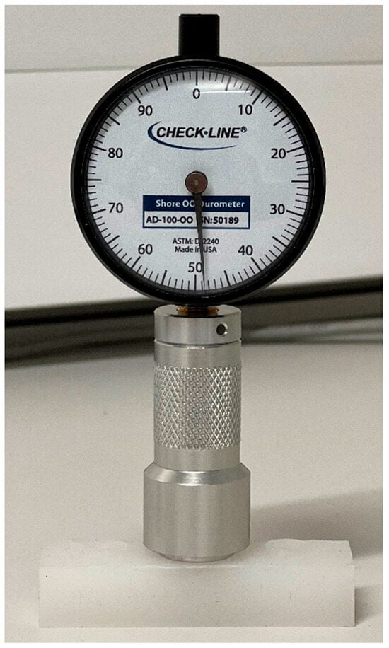The AD-100-OO Precision Shore Durometer (Checkline Europe, Enschede, The Netherlands) was used to assess the hardness of the cured silicone tissue from the dip pot, as depicted in Figure 4. The durometer was placed on the surface of the tissue with the footpad at a slight angle and then gently rolled to a flat position for the most accurate reading. Readings were taken from multiple sites on the tissue and averaged. This process was repeated for tissues with varying levels of retarder, deadener, and hardener. Consequently, a record was produced to observe changes in tissue hardness depending on additives.