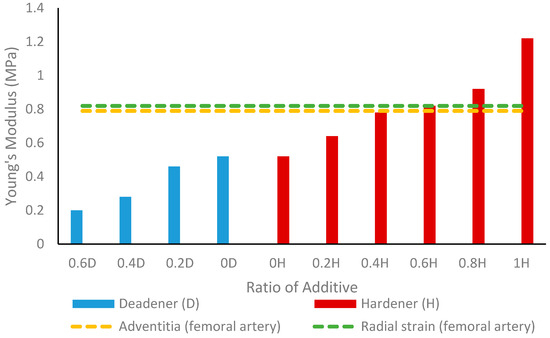 Tensile test results showing Young’s modulus values of custom vessels with different amounts of hardener and deadener. The ratio of additive is relative to the total weight of the elastomer while maintaining equal amounts of Part A and Part B. The Young’s modulus of a healthy femoral artery, in terms of the adventitia and radial strain [], is shown using dotted lines.