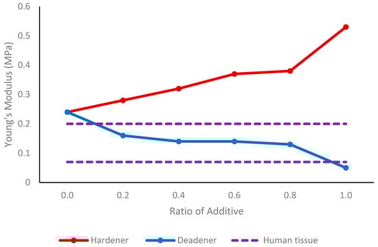 Compression test results showing Young’s modulus values of custom tissues with different amounts of hardener and deadener. The normal range for tissue found in the human finger [] is indicated by the dotted lines.