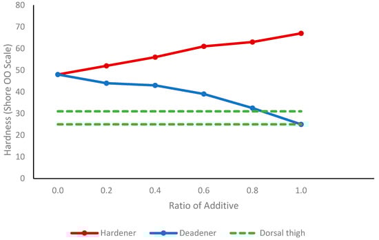 Change in Shore hardness with different amounts of hardener and deadener. The normal range for tissue found in the dorsal thigh [] is indicated by the dotted lines.