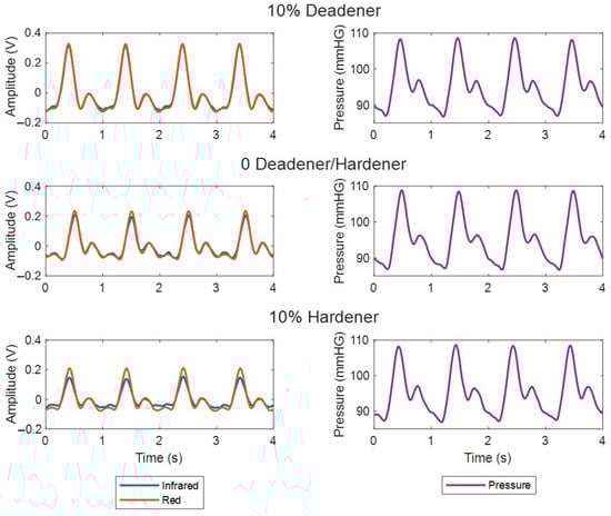 PPG and pressure signals recorded from custom vessel–tissue phantoms with vessels of varying stiffnesses induced by mixing different additives (hardener and deadener). The percentage of additive shown is relative to the total mixture.