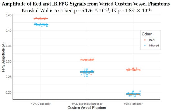 PPG signals were recorded from three phantoms composed of vessels with varying elasticities to determine if the elasticity influenced the PPG waveform, particularly the amplitude. The softer vessel phantom was created using a ratio of 0.2 deadener (10% of total weight) and the stiffer vessel phantom was made with hardener at a ratio of 0.2 (10% of total weight). The third vessel phantom did not contain additives. Red and infrared PPG signals were recorded and analysed on a cycle-by-cycle basis, which showed that as vessel stiffness increased, PPG amplitude decreased. Kruskal–Wallis analysis followed by a Dunn test found this change to be statistically significant (p < 0.001). This confirms the hypothesis that PPG signals can indicate changes in arterial stiffness, particularly through amplitude changes. This trend is as expected considering the physiology of blood vessels and PPG. Stiffer vessels are less elastic and therefore are less able to expand when the blood pulse wave arrives at the PPG sensor. As PPG is a volumetric technique, and the reduced expansion results in a lower change in the volume of blood at the site, the amplitude of the signal is lower.