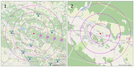 The research location (red dot). Panel 1 shows the state monitoring stations (olive dots)—current state for 2021. Panel 2 shows green areas and roads. Circles represent the 10, 20, 30, and 40 km radii for Panel 1 as well as 0.5, 1.0, and 1.5 km radii for Panel 2.