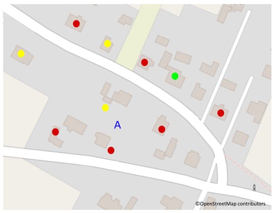 Location A, where the research was conducted, surrounded by the neighbors’ chimneys for eco-pea coal stoves (yellow dots) and coal stoves (red dots). One chimney was not used (green dot).
