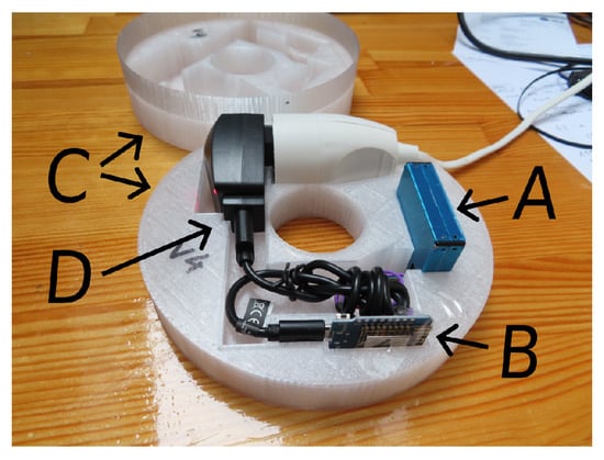 Particulate matter sensor PMS7003 (A) and microcontroller ESP8266 (B) with power supply (D) in case (C).