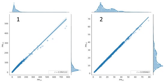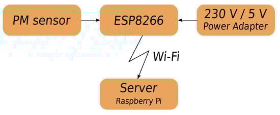 A low-cost sensor (LCS) provides the possibility of building affordable wireless and wired measurement networks. LCSs scattered around the city give equally helpful information, though slightly different, as per one certified sensor []. For PM measurements, they have been successfully used to determine dust quality in power plant cooling towers []. Together with other sensors, they can be components of portable or stationary multisensor platforms for measuring PM and CO, NO2, O3, SO2, CO2 gases, and volatile hydrocarbons (e.g., benzene) []. It is also possible to measure PM by indirect methods using artificial neural networks based on measurements of NO2, temperature, humidity, and wind speed []. Information on PM can also be obtained through satellite measurements [] or by using a fusion of data from LCSs placed on cars and stationary stations. The latter method was used to model the distribution of pollutants [].