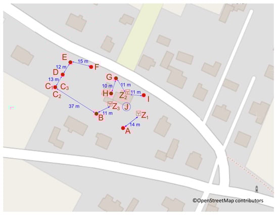 The networkfor measuring particulate matter: (A–J)—Location A–Location J of the sensors; (Z)—power supply of the measuring network.