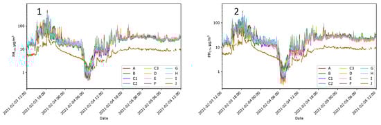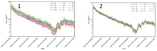 where is the i-th indication acquired from sensor k; A, B, C1, C2, C3, D, E, F, G, H, I, J}, and is number of indications accounted during this normalization related to sensor k. After recalculations, the indications from all PM10 sensors, expressed in µg/m3, became much more similar (Figure 7(2)).