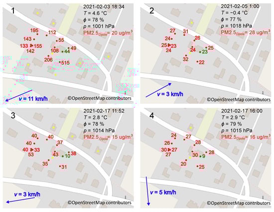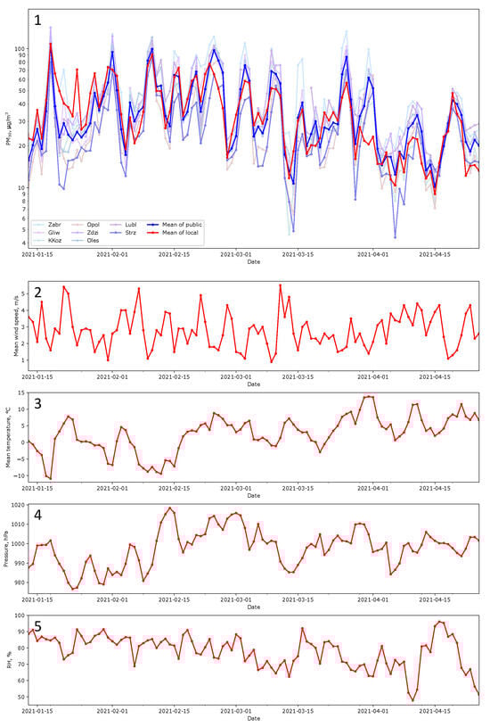 This research was conducted in the village of Staniszcze Małe, Poland, surrounded by forests. Geographical coordinates: 50°39′51″ N 18°19′32″ E, 190 m a.s.l. The terrain is flat. Within a radius of 20 km, the height above sea level ranges from 170 to 260 m. Data were collected during the heating season between January and April 2021, during the ongoing lockdown caused by the COVID-19 pandemic. Meteorological conditions, applicable during the tests, are collected in the report []. Figure 8(2) presents mean daily values of wind speed, temperature, pressure at the station level, and relative humidity (RH) registered by the state station in Opole (https://dane.imgw.pl/data/dane_pomiarowo_obserwacyjne/dane_meteorologiczne/dobowe/synop/2021/ (accessed on 17 February 2024)). The nearest state air quality monitoring station is almost 20 km from the research location; others are even further away—see the map in Figure 1(1). Therefore, none of the air quality information provided by these stations covers the study area. The village is disconnected from the gas network; heat pumps and photovoltaic installations are scarce. In the vicinity, there is no industry or main road. The primary heating sources in winter are eco-pea coal or fuel boilers of various origins characterized by low efficiency. The above shows that the primary sources of contamination are the home heating stoves.