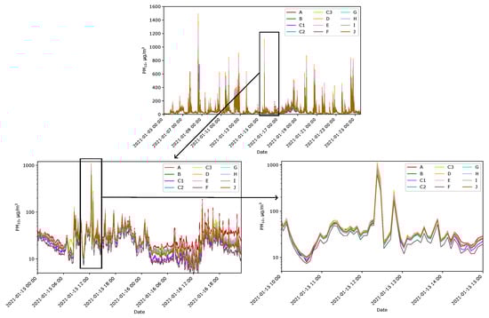 PM10 indications of Sensors A–J gathered at Location A and magnifications of selected periods.