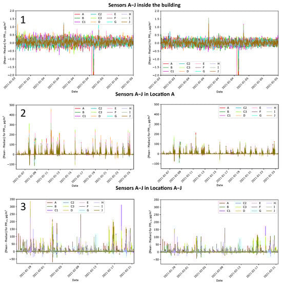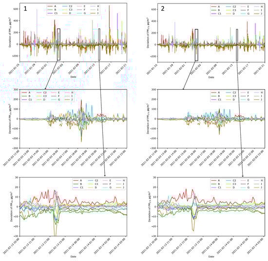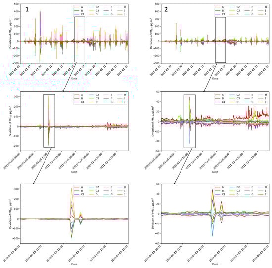 Deviation from mean indication of Sensors A–J measuring PM10 (Panel 1) and PM2.5 (Panel 2) at Location A. The first row presents a 20-day interval in January, while magnifications are in the following rows. The magnified periods are the same as in Figure 9. Notice the change in the y-axis scale.