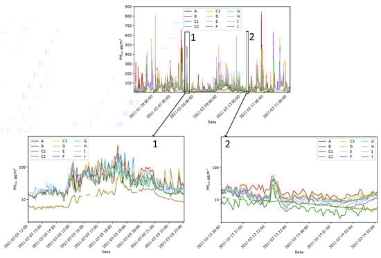 PM10 indications of Sensors A–J at Locations A–J in unfavorable weather conditions and smoke (1) and in good conditions without smoke (2). Note that the magnified plots are in the log scale on the PM axis.