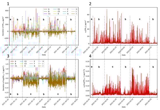 Differences in PM indications over four months. Deviations for Sensors A–I calculated as the difference between the particular indication and the mean over Sensors A–I (Panel 1) and the deviations calculated in the log scale according to Equation (5)—(Panel 3). Uncertainty contribution calculated using the Type A method based on Sensors A–I expressed in linear scale (Panel 2) and in log scale (Panel 4). In different periods, Sensors A–J were inside the building (a), outside the building at Location A (b), and spread outside the building at Locations A–J (c). During Period c, Sensor J was indoor, so its indications were lower than those of others.