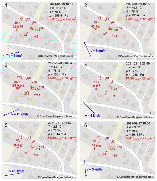 The data obtained from the measurement network confirmed the importance of choosing the sensor location. At periods when all sensors were at Location A and virtually no chimney was active, e.g., at 2021-01-15 3:00, the maximum differences in indications between all installed sensors were 10 µg/m3 and 8 µg/m3 for PM10 and PM2.5, respectively. The mean indications then were PM10 = 25 µg/m3 and PM2.5 = 19 µg/m3. When the smoke caused by operating chimneys was significant, e.g., at 2021-01-15 12:22, these maximum differences increased to 450 µg/m3 and 220 µg/m3, respectively. The mean indications then were PM10 = 780 µg/m3 and PM2.5 = 430 µg/m3.