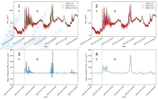Mean–median comparison for Sensor J. Panels 1 and 2 present raw signals acquired about every 1 s (red line), mean values (blue line), and medians (green line). The differences between the means and medians are shown in Panels 3 and 4. Panels 1 and 3 use 5 min time windows while Panels 2 and 4—1 h time windows. The sensor was at different locations: inside the building at Location J (Period c) and outside the building at Location A (Period b).