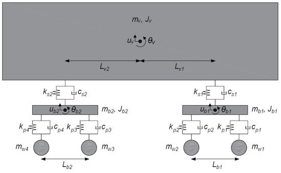 The vehicle is modelled as a series of three identical train carriages. A schematic of the train carriage is illustrated in Figure 1. Each carriage consists of a rigid vehicle body and two rigid bogies, each with a translation and rotation degree of freedom (DOF). Each of the four axles is associated with a translation DOF and each of the suspension systems is represented by a spring–dashpot unit. Each carriage is 24.56 m in length, with a distance of 2.56 m between axles on the same bogie and a distance of 16.44 m between the second and the third axles. The distance between the last axle of a carriage and the first axle of the next carriage is 6.00 m. The vehicle properties are listed in Table 1 and are based on those published by Iwnicki [].