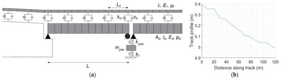 The rail track on the bridge is modelled as an Euler–Bernoulli beam resting on spring–dashpot units at 0.6 m intervals—see Figure 2a. Typical values were proposed by Zhai et al. [] and are adopted here. An overview of these properties is presented in Table 2. A track profile is incorporated into the system based on an actual track profile survey taken on a bridge published by Micu et al. []—see Figure 2b.