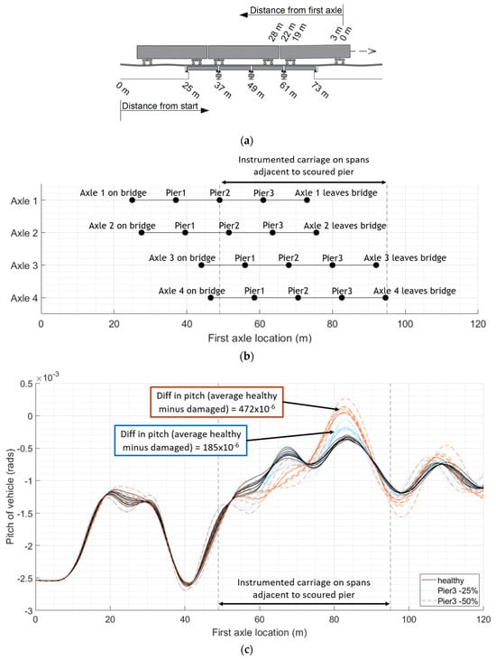 Figure 3 illustrates the rotation of the carriage body of the first carriage of the train as it travels across the 25 m approach length to the bridge, and then over the four 12 m long bridge spans. This is repeated for populations of train runs, both for the healthy bridge and when there is scour under Pier 3. Figure 3a gives the distance of each axle along the train, and the distance of each span from the start of the model. Figure 3b shows the progression of each axle of the first carriage across the bridge relative to the location of the first axle. Figure 3c shows the rotation of the carriage body of the first carriage of the train as it crosses the bridge. The pitch of the vehicle is in response to the apparent profile it experiences, a combination of the vertical profile of the track and the deflections of the bridge in response to the vehicle. A loss of foundation stiffness under a particular pier will influence the apparent profile of the adjacent spans. For scour under Pier 3, the first axle will reach the first adjacent span after travelling 49 m (i.e., 25 m approach length + 2 × 12 m spans) and will clear both adjacent spans after travelling 73 m (i.e., 25 m approach length + 4 × 12 m spans). The last axle of the first carriage will reach the spans adjacent to the scoured pier 22 m later, i.e., when the first axle is at 71 m, and will clear them when the first axle reaches 95 m. It can be seen in Figure 3c that, over this carriage interaction distance (from 49 m to 95 m), there is a clear divergence in the pitch for each population of vehicles, both from the healthy scenario when scour is present. The mean difference in the maximum pitch from a healthy baseline (as shown with solid black plots) and the pitch as a result of a 25% loss of stiffness (as shown with dotted blue plots) is 185 × 10−6 radians, and the mean difference in maximum pitch between the healthy baseline and a 50% loss of stiffness (as shown with dashed red plots) is 472 × 10−6 radians.