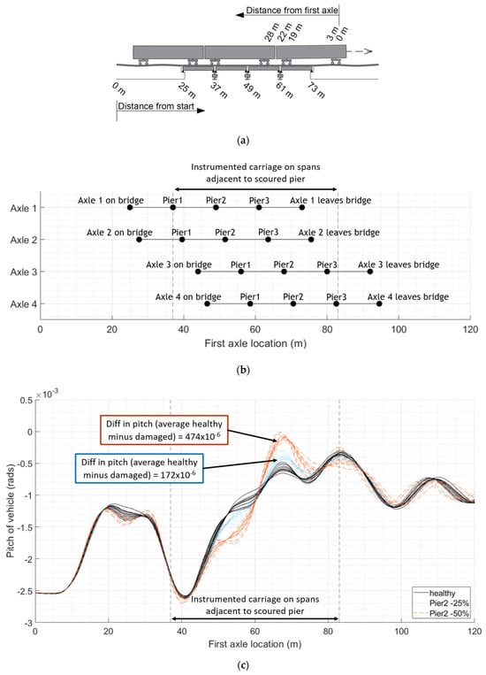 Comparing pitch of first carriage crossing bridge: (a) relative distances of span lengths from the start of the numerical model and relative distances of axle spacings from the first axle; (b) position of each axle of the first train carriage relative to the location of the first axle and the location of the bridge piers; (c) pitch of vehicles with varying mass and velocity crossing bridge with increasing loss of stiffness under Pier 2.