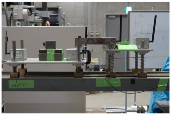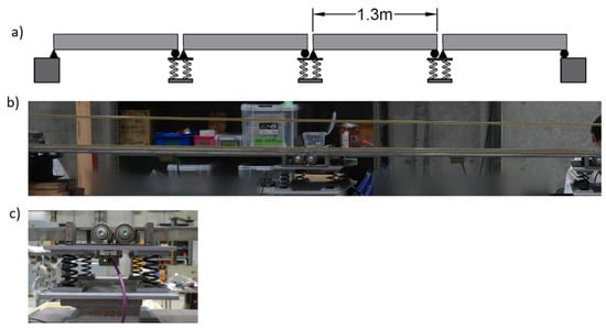 The laboratory test structure is a multi-span bridge consisting of four 1.3 m long simply supported spans supported on three internal piers on springs and two rigid abutments—see Figure 5. The cross-section is a 300 mm wide, 8.07 mm deep steel plate with two 8 mm square steel rails, which provide a track for a test vehicle to drive on. The rail profile is level. The model properties, which were supplied by the manufacturer, are given in Table 5.