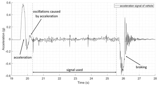 A typical raw acceleration signal (from the axis aligned with the direction of travel) is shown in Figure 7. The sudden acceleration and deceleration of the vehicle results in large peaks at the beginning and end of the signal. These occur on the acceleration and deceleration ramps at either end of the bridge, with the resulting oscillations caused by the acceleration continuing into the beginning of the bridge before damping out. These peaks and associated oscillations dominate the acceleration signal and are removed before the signal is filtered to remove the high-frequency content. This results in a small portion of the signal, which corresponds to when the vehicle is on the start of the first span of the bridge, to also be removed. The portion of the signal used is indicated in Figure 7. The remaining signal is filtered using a sixth-order low-pass digital Butterworth filter with a normalised cut-off frequency of 1 Hz. The resulting filtered signal will consist of the static component of the signal.