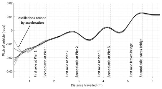 Each test population consists of 10 vehicle runs across the bridge. Rotations from the 10 healthy bridge journeys are illustrated in Figure 8. The graph shows the measured pitch of the vehicle tractor (which can rotate independently of the trailer) as it travels across the bridge. The location of the vehicle on the bridge is given relative to when the first axle crosses onto the first span. The test bridge itself does not sit level, with the underlying pitch of the vehicle increasing from 4.7 × 10−3 radians to 11.9 × 10−3 radians (a gradual increase in the region of 0.4°).