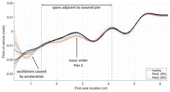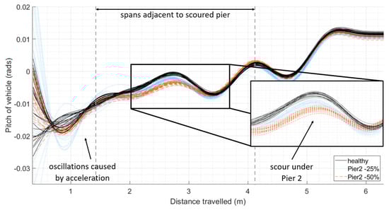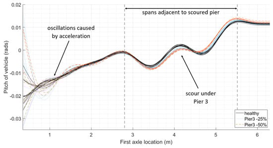 The effect of the modelled scour under Pier 3 on vehicle pitch is shown in Figure 9, where the healthy test scenario (as shown with solid black plots) is compared to a 25% (as shown with dotted blue plots) and 50% (as shown with dashed red plots) reductions in stiffness under the pier. No discernible difference can be observed between the pitch of the vehicle on the three different test scenarios until the vehicle is on the spans adjacent to the scoured pier. On the approach to the scoured pier, the increase in vehicle pitch lessens for both scour conditions, and once past the pier, the decrease in vehicle pitch is also lessened for both scour conditions. This is apparent while the vehicle is on either of the spans adjacent to the scoured pier. The maximum difference of the mean vehicle pitch between the healthy runs and the 25% damage runs is 1.5 × 10−3 radians in the vicinity of Pier 3, and the difference in the mean vehicle pitch between the healthy runs and the 25% damage runs is 2.0 × 10−3 radians.