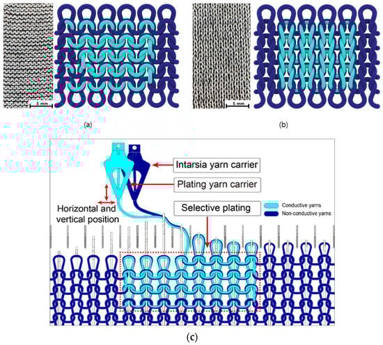 Illustration of machine-knitted textiles incorporating strain sensors, utilizing conductive yarns (light blue) and non-conductive yarns (dark blue). The figure demonstrates (a) the purl stitch pattern, (b) the knit stitch pattern, and (c) the plated knitting technique used for integrating the strain sensor. For parts (a,b), both the textile’s appearance and a schematic of the front side are shown.