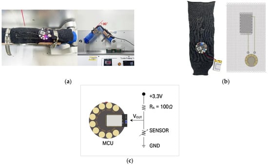 The experimental setup used to measure the dynamic bending resistance of the sample: (a) E-textile flexing tester; (b) wireless fabric sensor system consisting of a purl stitch plated sensor, an MCU module, and an interconnection module, and the inset (on the right side) shows a schematic of a fabric sensor system; and (c) a schematic of the voltage divider in the sensor system that shows the calculation of the voltage drop (Vout) across the sensor.