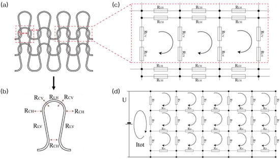 A weft plain fabric consists of continuous loops that are interconnected in the course direction and intermeshed in the wale direction. The 1 × 2-unit loop, which is analogous to a fabric circuit network, as illustrated in Figure 3c, forms the basis for constructing a complete fabric circuit network. This network incorporates two types of resistors: vertical resistance (RV) and horizontal resistance (RH). RV is calculated as the sum of RLV and RCV, which are arranged in series along the wale direction. Meanwhile, RH is determined using the formula 1/RH = 1/RCH + 1/RLH, where RLH and RCH are connected in parallel in the course direction. Figure 3d illustrates a simplification of this circuit network.
